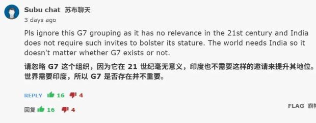 “現在的G7之所以對印度如此冷漠,説白了就是印度沒有多少價值了。悲哀的是,印度卻認不清自己的處境,還為莫迪出席G7峯會搞了五六年的大內宣,彷彿印度已成為西方工業集團中的重要一員。G7本質上就是一個富人俱樂部,每一次峯會都是以世界經濟指導者自居,別的國家只有乖乖聽從G7發號施令的份。但是隨着中國的崛起,G7的地位就急劇下降。因為對抗中國力不從心,所以美國從2018年開始就在醖釀為G7引入新鮮血液,也就是所謂的‘G7+N’模式。”
