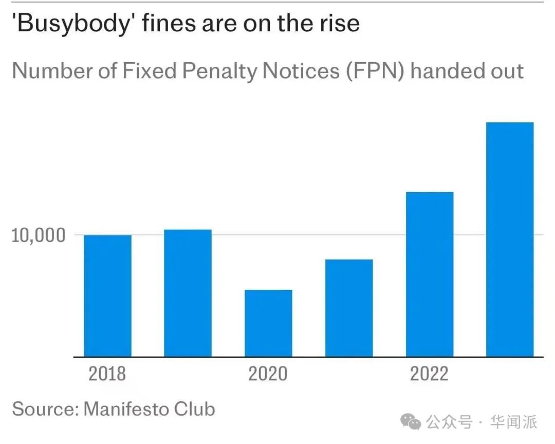 從2020年起,“多管閒事罰款”連續多年持續上升。根據公民自由組織Manifesto Club的研究數據顯示,在2023年裏,這類罰款比上年激增了42%,各地政府共計開出了近2萬張罰單。
