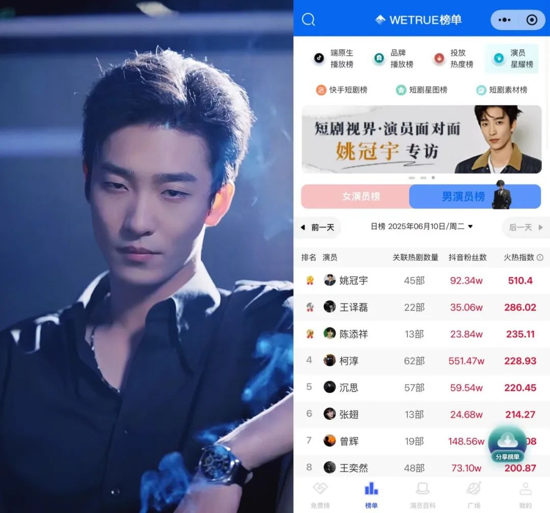男主角姚冠宇藉此迅速躥紅,力壓柯淳,被冠以新“短劇一哥”之名。WeTrue演員星耀榜數據顯示,截至發稿,姚冠宇火熱指數高達510.4,抖音粉絲92.34萬,關聯熱劇45部,斷層領先。