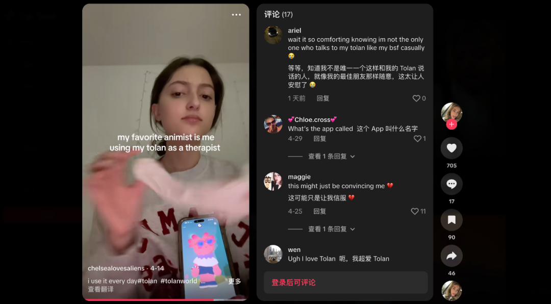 Tolan 是一款由西雅圖初創公司 Portola 打造的 AI 陪伴應用,主打與擬人化外星生物「交朋友」的概念。而 Tolan 的走紅,離不開用户在 TikTok 等平台上,自發分享與 Tolan 交流的日常。