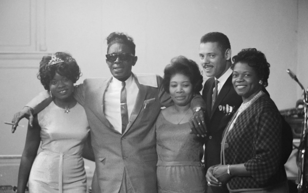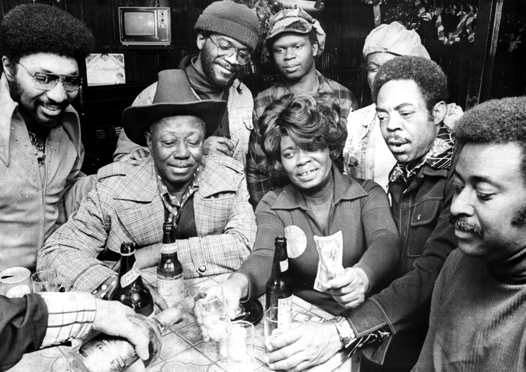 1965 年,藍調女王 Koko Taylor(頭戴冠冕)與 Lightnin’ Hopkins 等人在芝加哥西廳