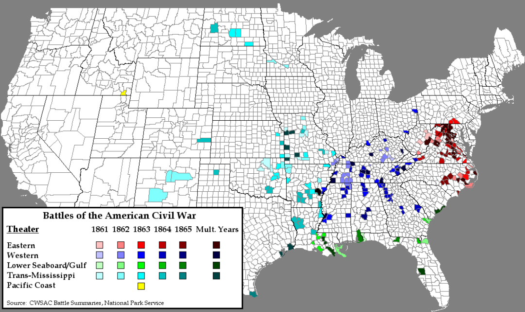 在加拿大謀求自治的同時,領土一路高歌猛進的美國也迎來了一場內亂。隨着領土西進,北方的自由州和南部的蓄奴州對於新加入美國的地區,到底該是蓄奴州還是自由州,進行了激烈的爭奪,最終導致南方宣佈退出聯邦,內戰爆發。