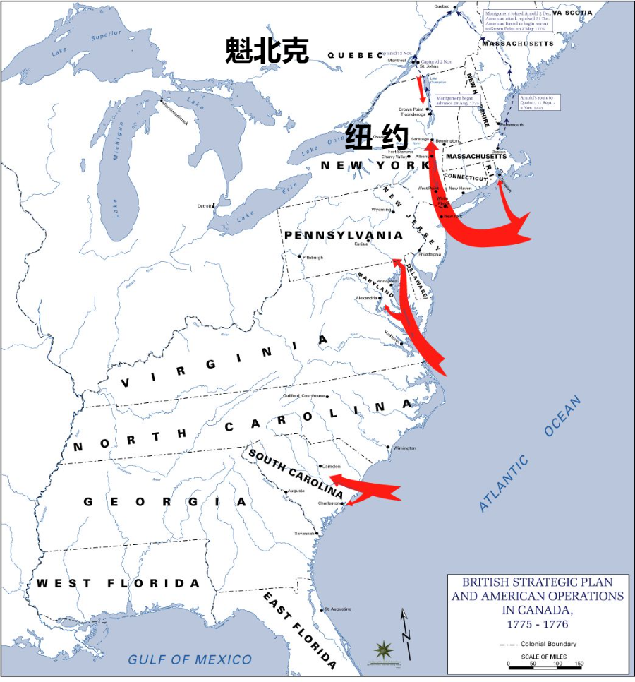 ▲紅色箭頭為獨立戰爭中英軍的進攻線路