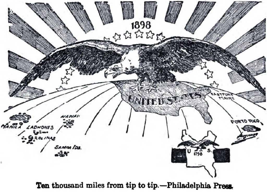 ▲1898年漫畫《自此至彼相隔萬里》,以白頭海雕(美國國鳥)代表美國領土擴張至波多黎各與菲律賓