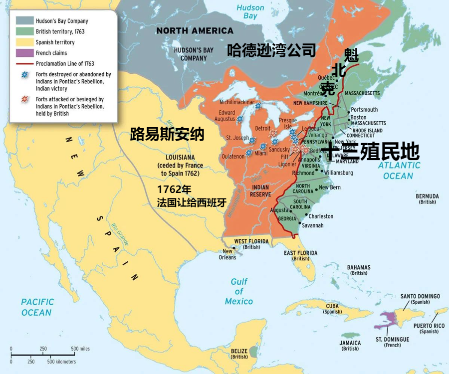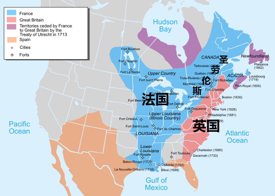 截至17世紀中期,英國和法國是瓜分北美的兩大勢力。法國在建立了北起哈德遜灣,南至墨西哥灣的“新法蘭西”殖民地,英國主要在靠近大西洋沿岸建立起13塊殖民地。