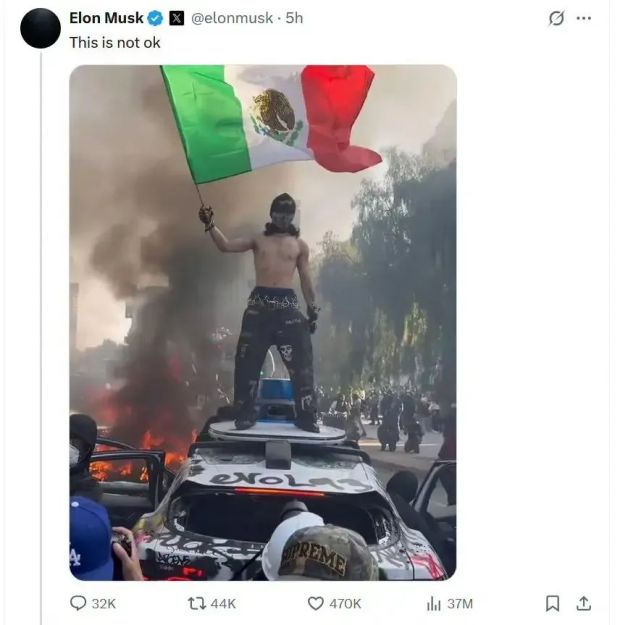 馬斯克這個時候還跳出來指責墨西哥裔在洛杉磯大戰中舉墨西哥旗“不對”……充分體現了他資產階級的軟弱性,也充分體現了他對美國的皈依者狂熱。墨西哥裔舉墨西哥旗有什麼不對?誰能證明這塊土地是美國人的?誰説這塊土地就不能是墨西哥人的?馬斯克格局有點低,也沒有鬥爭精神,都被美國政府和特朗普拋棄了,還站在美國的立場上説話,簡直愚不可及,這個時候,就應該舉他自己祖國的南非旗。