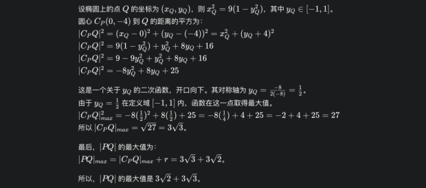 Gemini 2.5 Pro Preview 抓住瞭解題的關鍵點:PQ 的最大距離應該等於圓心到橢圓上點的最大距離加上圓的半徑。豆包 1.5 則闡述了這個關鍵點背後更本質的邏輯: | PQ|≤|PO| + |OQ|。意識到這一點之後,通過參數化方法求解 P 的軌跡即圓的圓心到橢圓C的最大值即可。