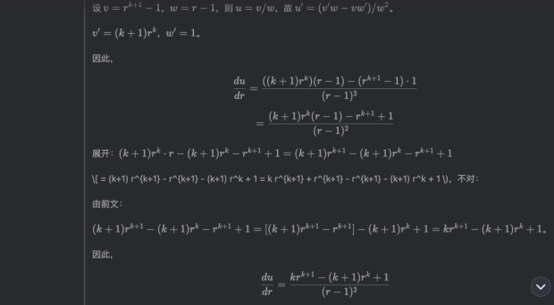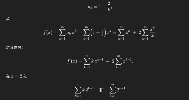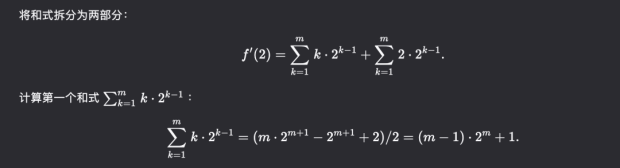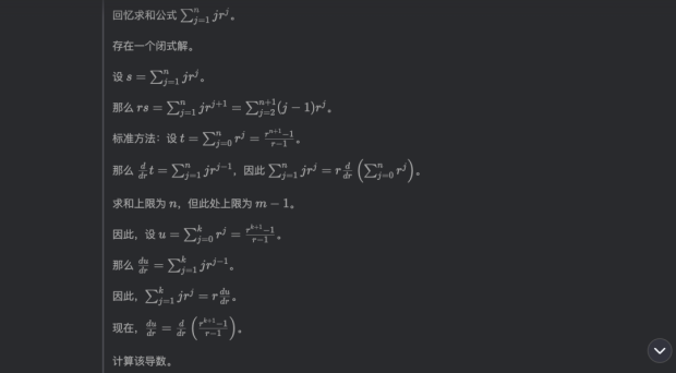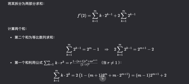 一開始比較依賴變量推理,後來發現代入底數 2 計算會更加方便,這裏耽誤了比較大的時間,Kimi K1.5 也是類似的做法。但 DeepSeek R1 在原函數與導數之間靈活變化的做法值得借鑑。比如幾何級數的和更容易計算,就先計算再求導,調和級數的和更難計算,就先求導變為幾何級數再求和。