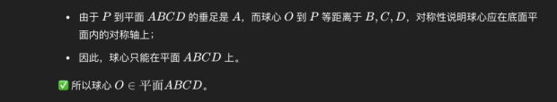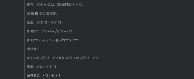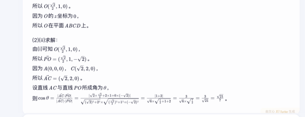 文心 X1 類似,使用座標法計算 O 的座標時也算錯了,自然直線 AC 與直線 PO 所成角的餘弦值也會算錯。