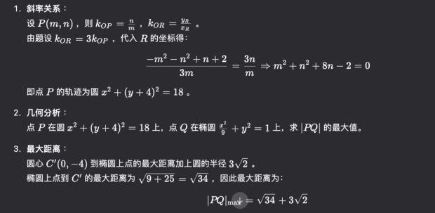 和文心 X1 一樣,DeepSeek R1 也糾結 Q 和 P、R 是否有關係。甚至自己改題目,推測 “ P ” 可能是一個筆誤,應為 “ Q ”,即 “ 直線 OR 的斜率是直線 OQ 的斜率的 3 倍 ”。