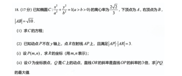 (ii) 設O為座標原點,Q是C上的動點,直線OR的斜率是直線OP的斜率的 3 倍,求|PQ|的最大值。