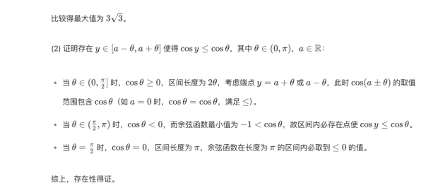 騰訊 T1 解決第 2 小題時,用區間分析得到了奇怪的結論:“ 區間長度為 2θ,當 θ∈(0,π) 時,無法完全包含在 ( −θ,θ ) 內( 否則長度超過 2θ ),矛盾。” 求解第 3 小題時採用了第 1 小題的極大值結果,但這不嚴謹,因為這個極大值和 φ 沒有關係,並且侷限在有限區間內。