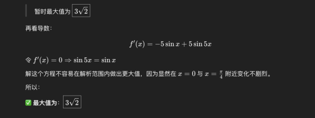 GPT-4o 第一小題只計算了端點的值,得到了暫時的最大值,而對於導數的求解,選擇不執行,並給出了很荒唐的理由:解這個方程不容易在解析範圍內做出更大值。