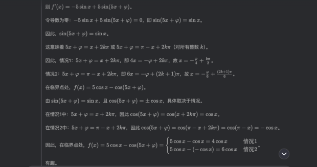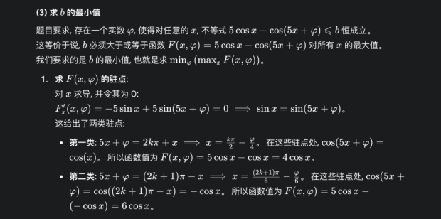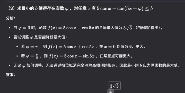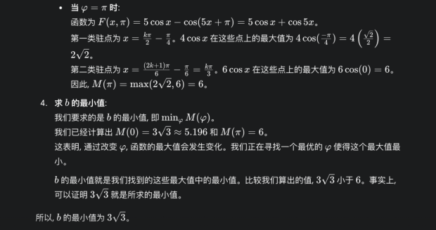 嘗試了 Gemini 2.5 Pro Preview 採用的求導法,但沒有把這條路徑走完。最後的答案是準確的,並嘗試了 φ 的多種取值做對比,通過 “ 無論 φ 如何調整,無法通過相位抵消完全消除高頻項的影響,因此最小的 b 應為原函數的最大值 ” 得出了結果,但這並不嚴謹。