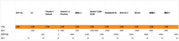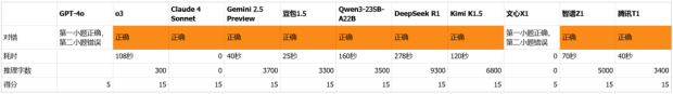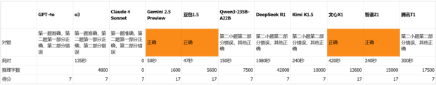 這一道題翻車的就多了,而且出錯的方式五花八門。只有 Gemini 2.5 Pro Preview、豆包 1.5、文心 X1、智譜 Z1 全對,其它全部栽在第 2 小題第二部分。