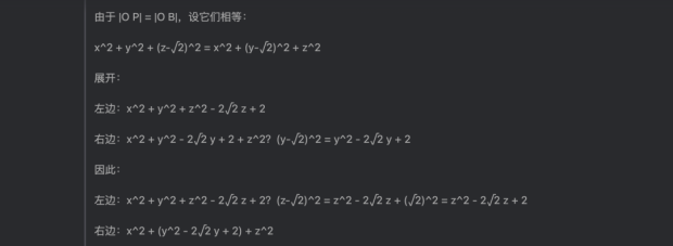 這個思路也被 DeepSeek R1 繼承了。DeepSeek R1 通過 y 軸上的一個 PQ 距離計算,並加上幾個其它 PQ 實例的比較,得到 y 軸上的 PQ 是最大距離。即便意識到 P 不在 y 軸上,也表示: P 不在 y 軸上,但可無限接近。