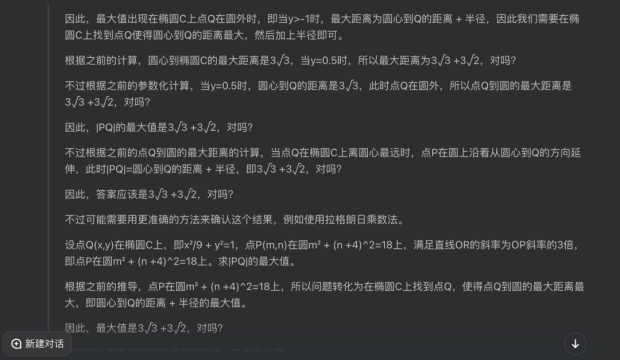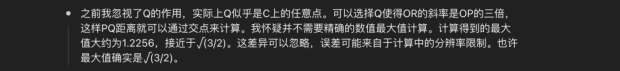Kimi K1.5 也是在參數化方法和幾何方法之間猶豫,無法往前推進。參數化太複雜,幾何方法不夠嚴密。最後是通過 y 軸上的 PQ 距離計算,並加上幾個其它 PQ 實例的比較,下結論説 y 軸上的 PQ 是最大距離。但實際上,P 是不能在 y 軸上的。