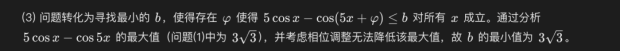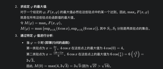 對第 3 小題的求解,GPT-4o 只是通過三角函數最大值為1的特性,進行數值舉例,找到了一個使得上界比較大的 φ 值,就輕易下了結論。而沒有考慮到,這不是找上界,而是最小上界。需要通過特定的 φ 值,讓這個上界最小。