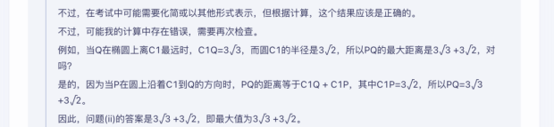 在思維鏈部分,豆包 1.5 嘗試過純參數法( 不借助圓心,直接用參數表示 PQ 距離 ),因為過於複雜而放棄。對正確答案有過懷疑和猶豫,但次數不多,最後並沒有找到好的辦法來驗證。