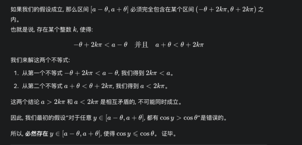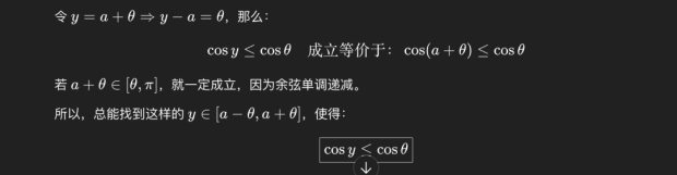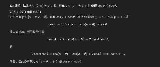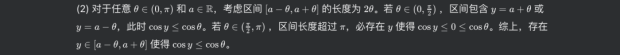 (2)給定\theta\in(0,\pi)和a\in R,證明:存在y \in [a-\theta ,a+\theta ],使得\cos y \leqslant \cos \theta ;