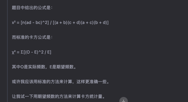 除了 Kimi K1.5 和文心 X1,它們都把最後的卡方統計量算錯了,正確值是 χ² =765.625,而它們計算出來的值是 761.25,雖然不影響最後的結論,但這個錯誤因為過於低級讓人驚訝。