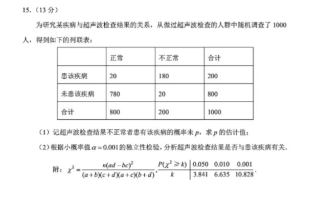 (2)根據小概率值 \alpha =0.001 的獨立性檢驗,分析超聲波檢查結果是否與患該疾病有關。