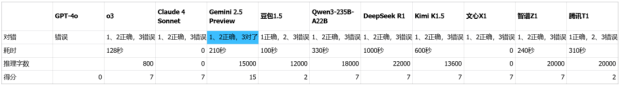 其它模型之間整體相差不大,最後一名是 GPT-4o,這並不奇怪,畢竟它不是推理模型。倒是 o3、Claude 4 Sonnet,作為行業領先者的表現還是挺令人失望的,很多錯誤甚至有點離譜。