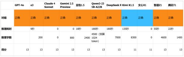 本題的評分結果,Kimi K1.5 和文心 X1 各扣 2 分,其它模型滿分。