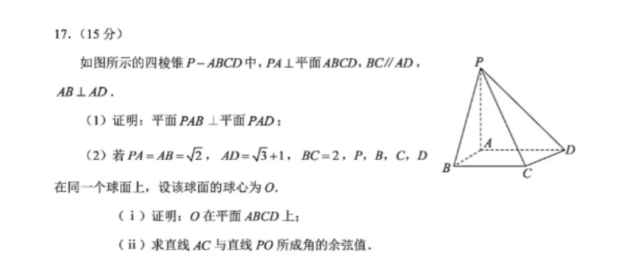 對於第一小題,GPT-4o 參考的關於兩個平面垂直的判定原則是對的,但用錯了對象,應該以 AB 為推理線索,而不是 PA,證明 AB 垂直於 PAD 上兩條不共線的直線。