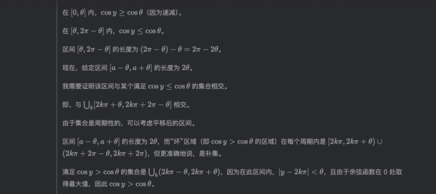 Gemini 2.5 Pro Preview 第一題採用常規解法,無需細説。第 2 小題,Gemini 2.5 Pro Preview 通過餘弦函數的區間單調性,找到了滿足 cos x>cos θ 的區間: