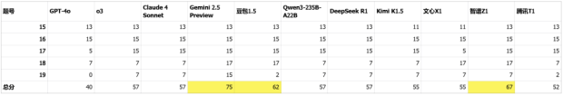 前三名分別是 Gemini 2.5 Pro Preview、智譜 Z1、豆包 1.5,得到了 75 分、67 分、62 分,後兩者都是在最後一題的最後一部分,才和 Gemini 2.5 Pro Preview 拉開了差距。