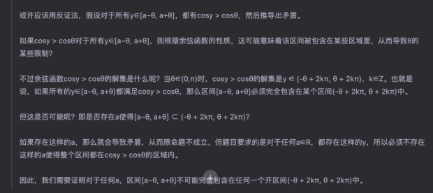 DeepSeek R1 求解第 2 小題時採用了正確的反證法,思路和 Gemini 2.5 Pro Preview 相同,但補齊了 Gemini 2.5 Pro Preview 得出滿足 cos x>cos θ 的區間的邏輯前提。