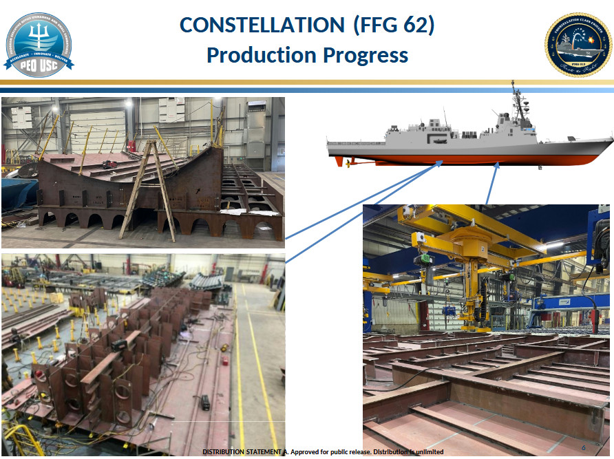 2023年美國海軍海上系統司令部(NAVSEA)的一份簡報幻燈片,展示了“星座”號的建造工作。美國海軍