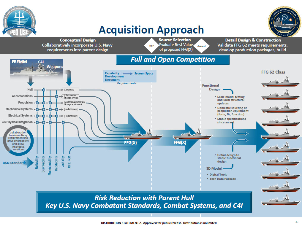 2022年美國海軍海上系統司令部的一份簡報幻燈片,展示了“星座”級護衞艦從FREMM母型衍生而來的採購方法。美國海軍