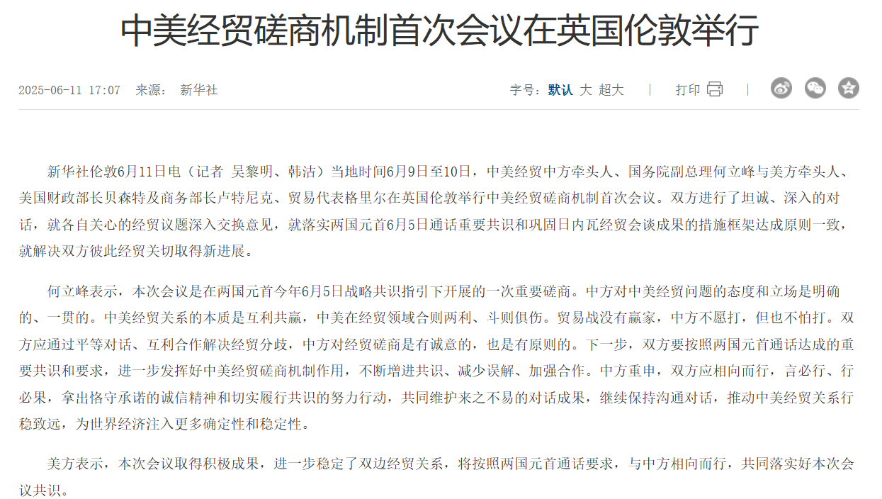 2. 會議結束後,雙方都公佈了聲明。基調是好的,互利共贏,中美在經貿領域合則兩利、鬥則俱傷。坦誠、深入的對話,深入交換意見。就落實重要共識、鞏固日內瓦經貿會談成果的措施框架達成原則一致,就解決雙方彼此經貿關切取得新進展。特朗普進行了日常的牛皮式發貼,又贏了,但邊際效應遞減,相信的人不多了。美方的聲明,也差不多,沒談什麼具體的事,但説“就實施已經達成共識的協議”,達成了協議。