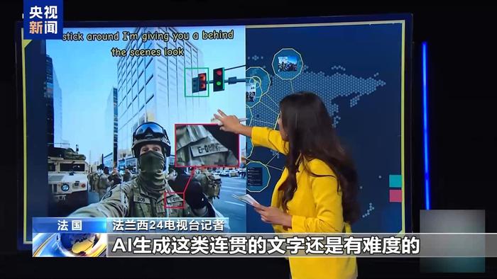法蘭西24電視台記者:如果我們仔細看這些截屏,比如鮑勃的胸章。正常來講應該有他的軍銜在上面,但現在卻是一段亂碼。如果是人工智能生成的這就可以理解了,AI生成這類連貫的文字還是有難度的。還有這裏的紅綠燈也很奇怪,這裏少了黃燈,這邊所有的顏色都糊到一起了。