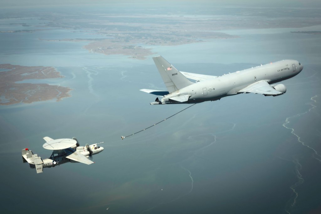 一架E-2D預警機在測試中與一架KC-46加油機對接。美國海軍埃裏克·希爾德布蘭特供圖