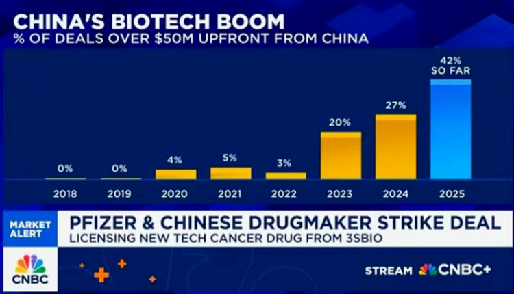 據統計,在首付款超過5000美元的BD交易中,中國分子的佔比逐年攀升,2025年已經來到了42%。