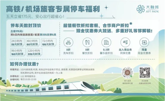還有高鐵/機場旅客專屬停車福利,五天立省175元,上海長寧Art Park大融城讓你安心出行超省心。