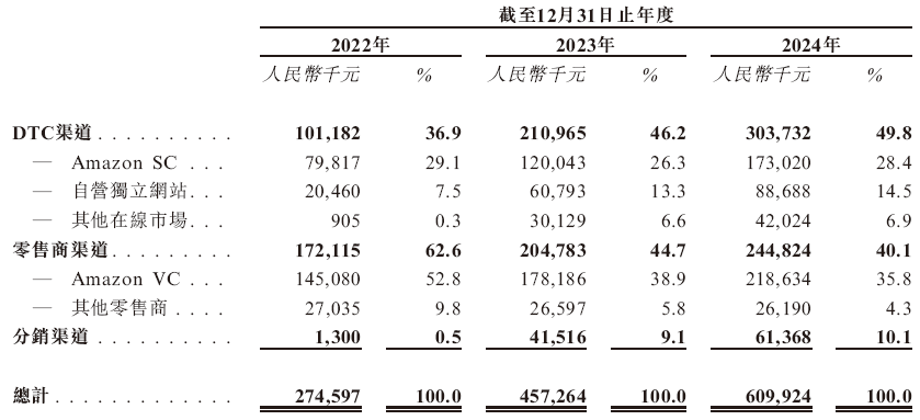 而公司的渠道銷售是其商業模式的另一大亮點。卧安機器人主要是DTC渠道(包括自營網站和電商平台直銷)收入以73.3%的複合年增長率狂飆,佔比從2022年的36.9%躍升至2024年的49.8%。尤其是自營網站增速非常明顯,而亞馬遜等平台雖然重要,但是佔比在不斷降低。