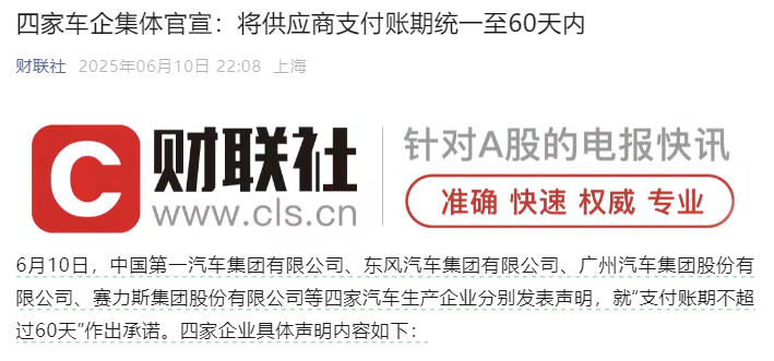 四大國有車廠帶頭示範,將供應鏈賬期縮短至60天!
