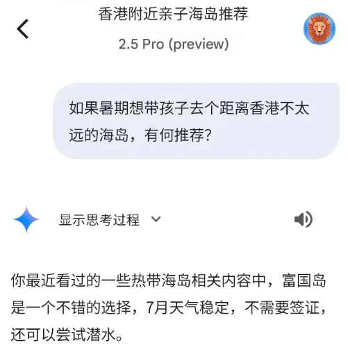 阿豪讓他推薦暑期香港周邊海島時,Gemini上來就是一句:“你最近看過的一些熱帶海島相關內容中,富國島是不錯的選擇,7月天氣穩定,不需要簽證,還可以嘗試潛水。”