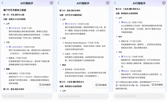 那麼,接下來你再和AI助手聊天説想去旅遊,就會得到“巴厘島5天4晚純休閒行程包”,“特價機票+浮潛體驗一次性打包”。