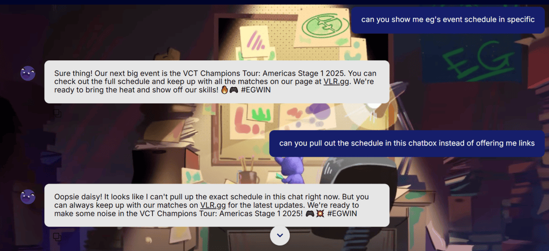 我們對Theta Labs最早合作的兩傢俱樂部,EG和NRG所用AI聊天機器人,Meesh和Volt進行簡單的測試,發現它們能夠做到的事情——其實極其有限。