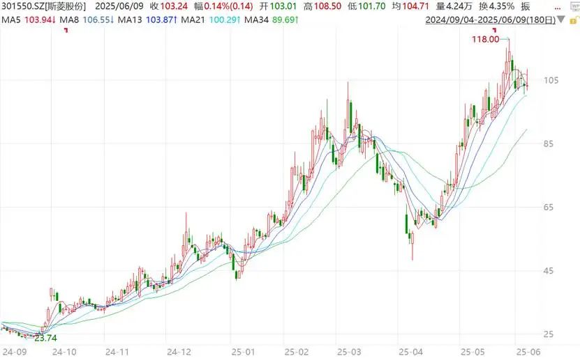 4月初,斯菱股份隨大盤調整一度跌破50元大關,然而在短短兩個月內不僅迅速收復失地,還不斷續創新高,最大漲幅超過140%。