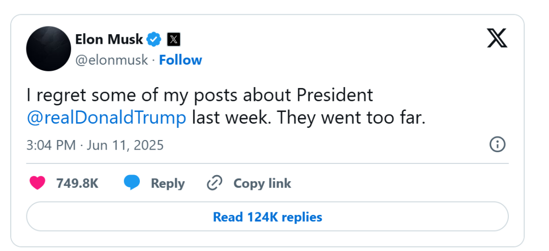 1)馬斯克和特朗普翻臉,我從一開始就斷定,兩人終究會走向某種形式的和解。同時,我也認定,馬斯克鬥不過特朗普。最新情況是,馬斯克“服軟”,對自己在“X”上一度對特朗普發飆表示“後悔”。特朗普則回應説,願意和解。