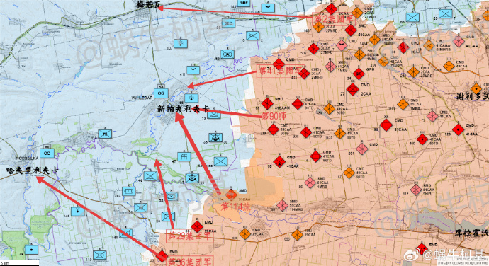俄軍還控制了大部分的新米科拉耶夫卡,這樣一來中部集羣90師和東部集羣50小時左右的推進結果如下