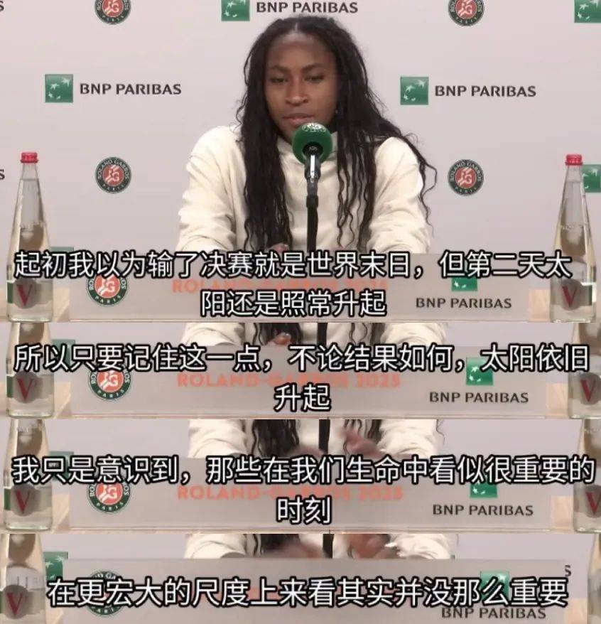 回溯起高芙2022年法網決賽的場景,落敗後她也過片刻恍惚,但很快就能調整好狀態並平靜表示:「當然有點失望,但我知道這不是最後一次機會,我會繼續努力。」