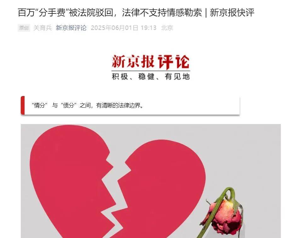 3、《新京報》2025年06月01日文章:百萬“分手費”被法院駁回,法律不支持情感勒索。