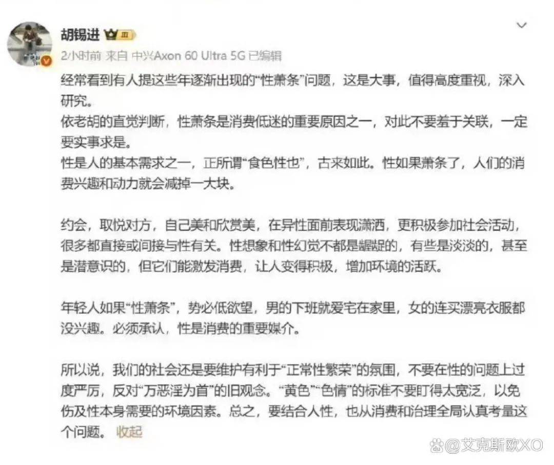 胡老師肯定看到,以年輕人和商務消費為主體的夜經濟,如約會、KTV 夜總會、酒吧、影院、演唱會等一片肅殺,不確定性在持續、螺旋上升。在非婚、戀愛和姻婚三種關係中,他希望放松管制,以性民Z、性自Y實現性活躍,進而激發異性消費,達到帶動部分內需消費的目的,為GDP和財政、也為人口接續做貢獻。